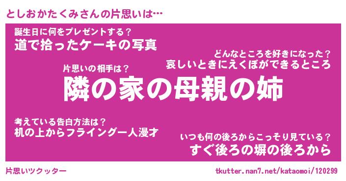 | 胡散臭い通販商品みたいなあだ名 | 『必ず成功するブレスレット…その名も「としおかたくみ」』 |