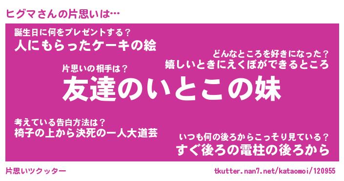| ヘコむあだ名 | 『ヒグにゅー』『豆乳』『ヒグを』 |