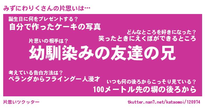 | ヘコむあだ名 | 『みずっふぃ~』『牛乳』『みずを』 |