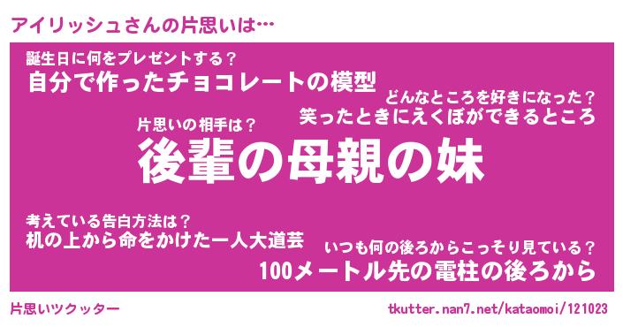 | ツイッター | アイリッシュさんのツイッターID『dendenmushi_man』 |
