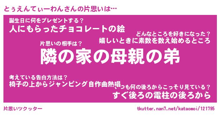 | 胡散臭い通販商品みたいなあだ名 | 『必ず成功するブレスレット…その名も「とぅえんてぃーわん」』 |