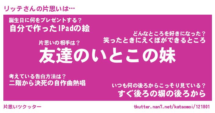 | ヘコむあだ名 | 『リッにゅー』『つくし』『リッっ子』 |