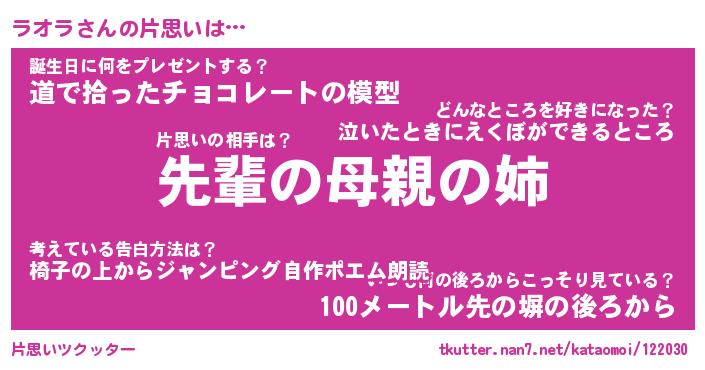 | ポケモン風あだ名 | 『ラオチュウ』『ラオラダネ』 |