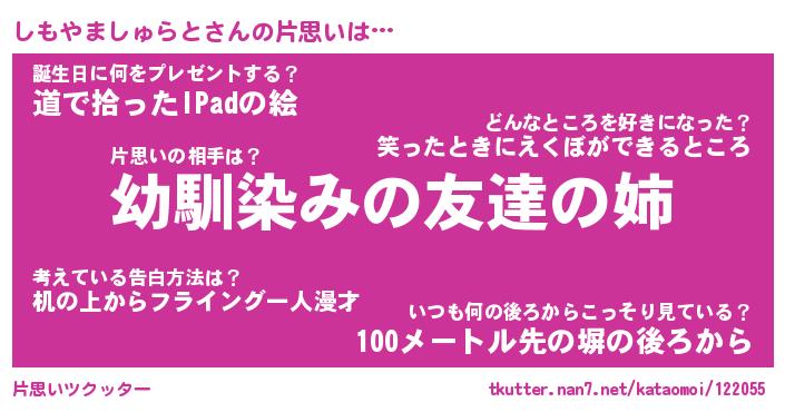 | 女子向けラノベタイトル風あだ名 | 『(仮)しもやましゅらとのやんごとなき事情』 |