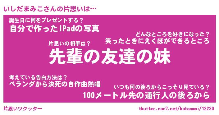 | ヘコむあだ名 | 『いしっふぃ~』『つくし』 |
