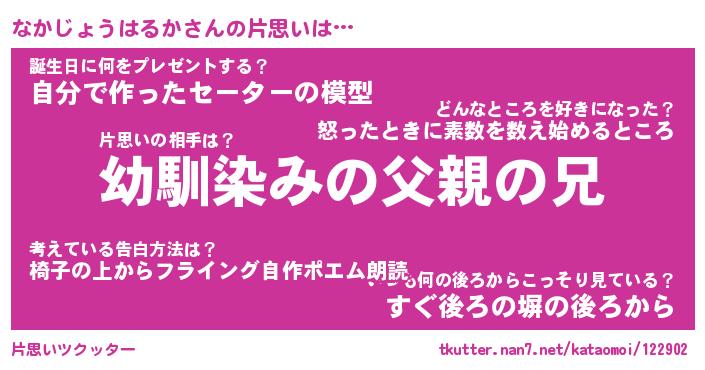 | 女子向けラノベタイトル風あだ名 | 『(仮)なかじょうはるかのやんごとなき事情』 |