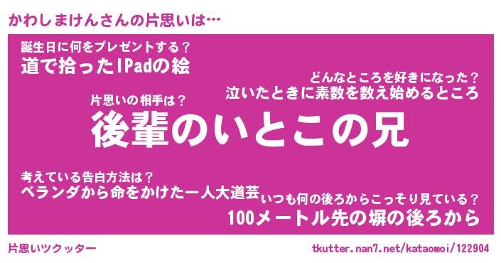 | 女子向けラノベタイトル風あだ名 | 『誰かこのかわしまけんを説明してください! ~契約から始まるウェディング~』 |