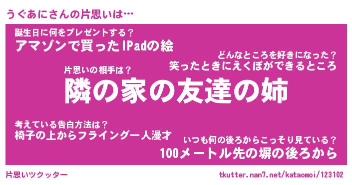 | 意味不明あだ名 | 『ペロリンうぐあに』『永久保存うぐあに』 |
