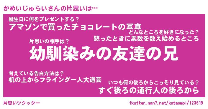 | 男性向けラノベタイトル風あだ名 | 『かめいじゅらいの憂鬱』 |