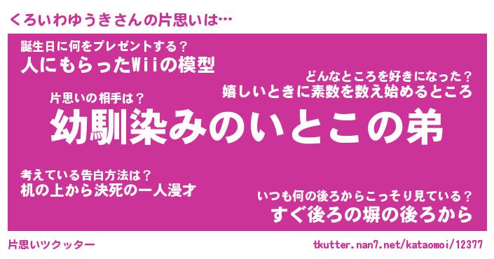 | 女子向けラノベタイトル風あだ名 | 『(仮)くろいわゆうきのやんごとなき事情』 |