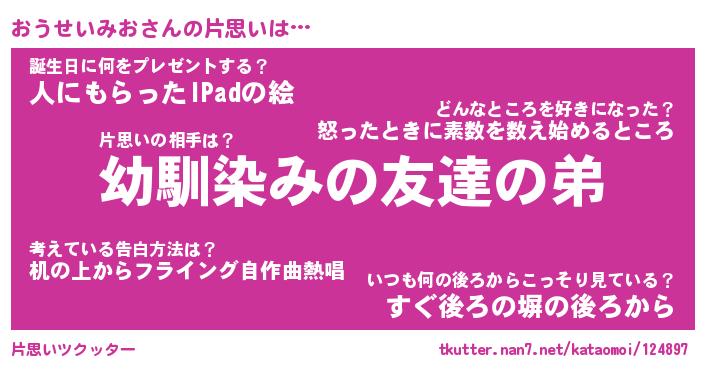 | 恥ずかしいあだ名 | 『プリティーおうせいみお』『おうっちょ』 |