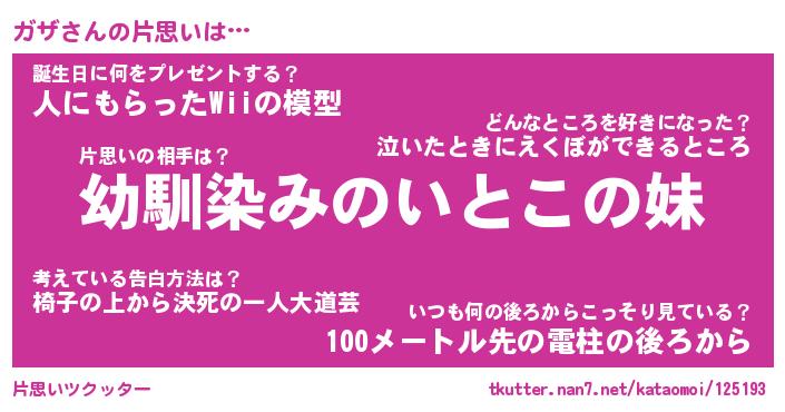 | ヘコむあだ名 | 『ガザもー』『酢こんぶ』『ガザお』 |