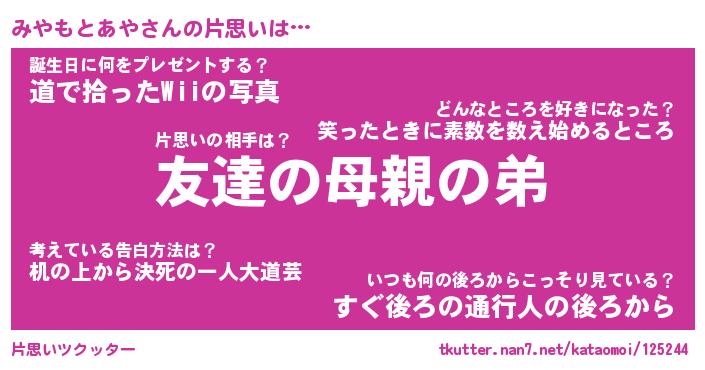 | ヘコむあだ名 | 『みやふぇ~』『豆乳』『みやぷりん』 |