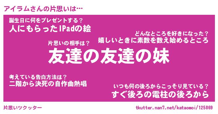 | 意味不明あだ名 | 『ペロリンアイラム』『永久保存アイラム』 |