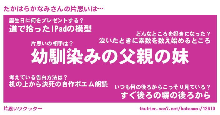 | 女子向けラノベタイトル風あだ名 | 『(仮)たかはらかなみのやんごとなき事情』 |