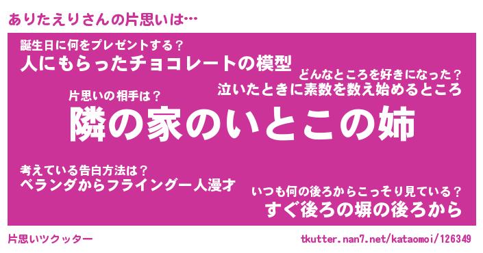 | 男性向けラノベタイトル風あだ名 | 『ありたえりの憂鬱』 |