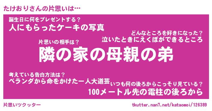| 男性向けラノベタイトル風あだ名 | 『たけおりの憂鬱』 |