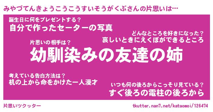 | ヘコむあだ名 | 『みやっふぃ~』『つくし』『みやお』 |