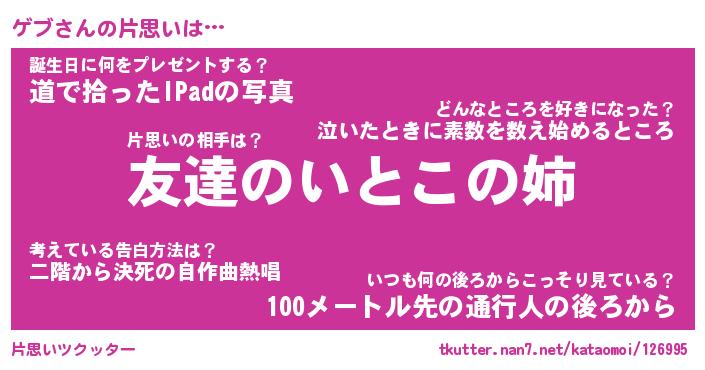 | ヘコむあだ名 | 『ゲブにゅー』『つくし』『ゲブを』 |