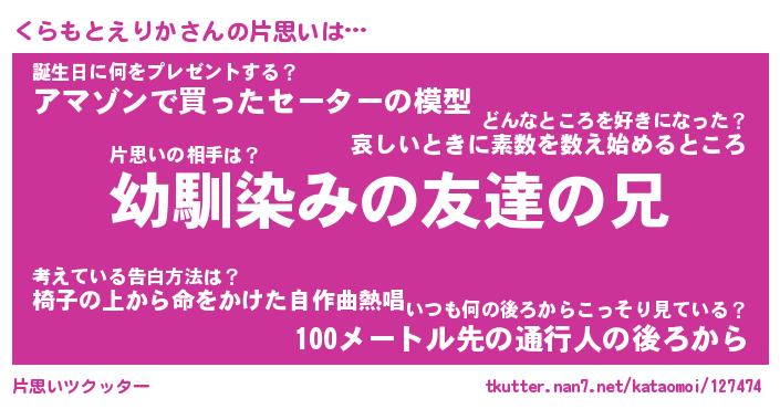 | 伝説のあだ名 | 『伝説のスナイパーくらもとえりか』 |