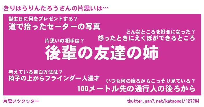 | ヘコむあだ名 | 『きりっふぃ~』『豆乳』『きりを』 |