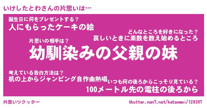 | 男性向けラノベタイトル風あだ名 | 『いけしたとわの憂鬱』 |