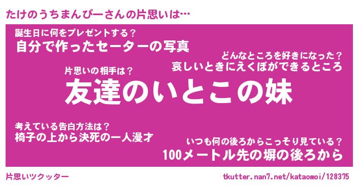 | ツイッター | たけのうちまんぴーさんのツイッターID『fukuyoka_idle』 |