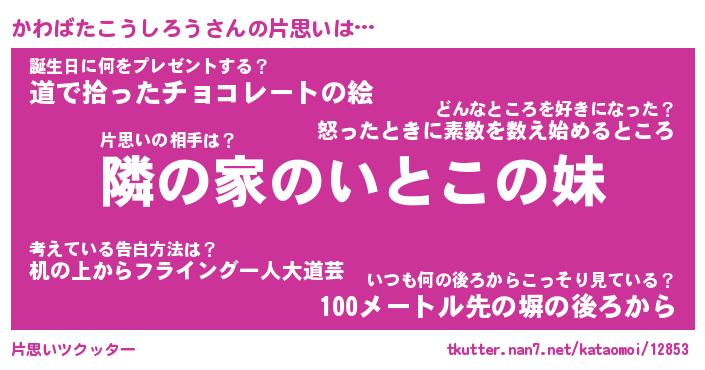 | 女子向けラノベタイトル風あだ名 | 『(仮)かわばたこうしろうのやんごとなき事情』 |