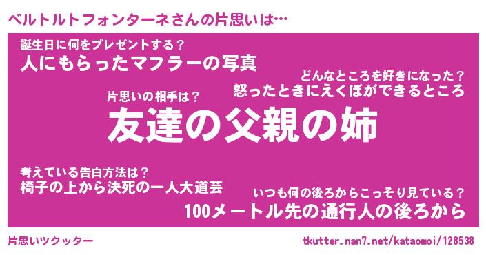 | 女子向けラノベタイトル風あだ名 | 『誰かこのベルトルトフォンターネを説明してください! ~契約から始まるウェディング~』 |