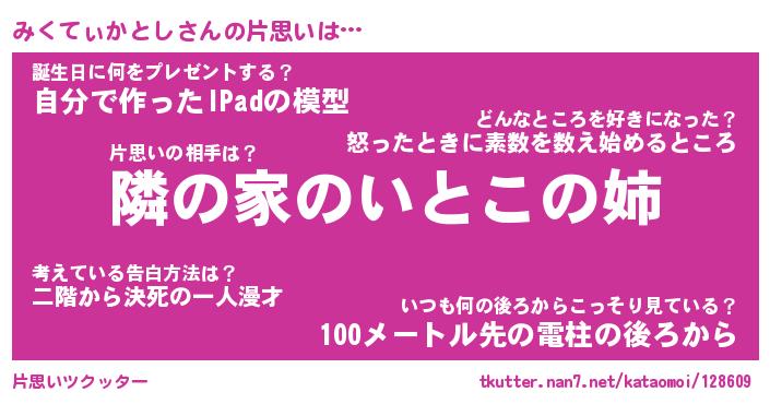 | 男性向けラノベタイトル風あだ名 | 『みくてぃかとしの憂鬱』 |