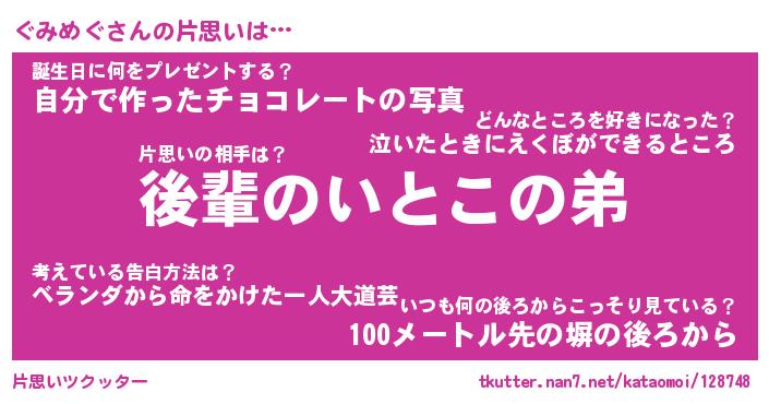 | ファンタジー風あだ名 | 『グミフェル』『エターナルグミメグー』 |