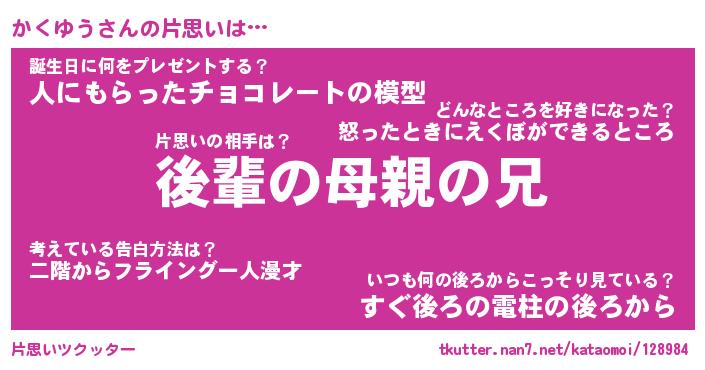 | 意味不明あだ名 | 『ペロリンかくゆう』『永久保存かくゆう』 |