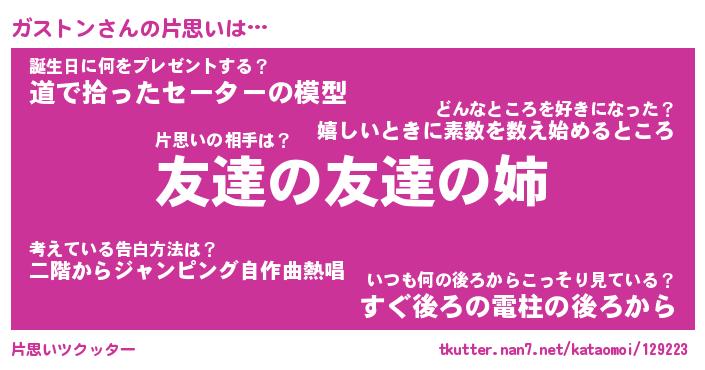 | 意味不明あだ名 | 『ペロリンガストン』『永久保存ガストン』 |