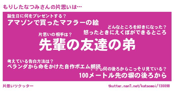 | 男性向けラノベタイトル風あだ名 | 『もりしたなつみの憂鬱』 |