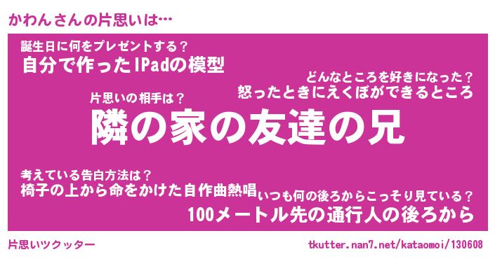 | 男性向けラノベタイトル風あだ名 | 『かわんの憂鬱』 |