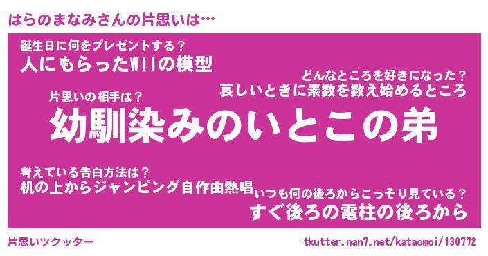 | 女子向けラノベタイトル風あだ名 | 『(仮)はらのまなみのやんごとなき事情』 |