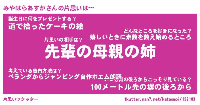 | ヘコむあだ名 | 『みやにー』『豆乳』『みや太郎』 |