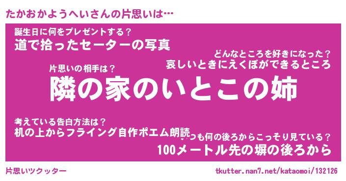 | 男性向けラノベタイトル風あだ名 | 『たかおかようへいの憂鬱』 |