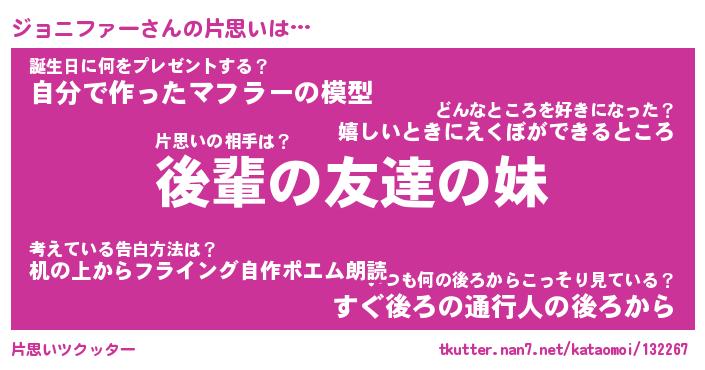 | ツイッター | ジョニファーさんのツイッターID『namakemono_kun』 |