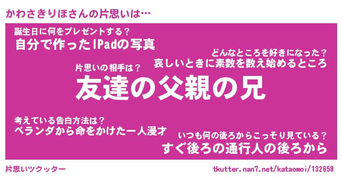 | ヒーロー風カッコイイあだ名 | 『スーパーカワサキリホ』『幻影騎士カワ』 |