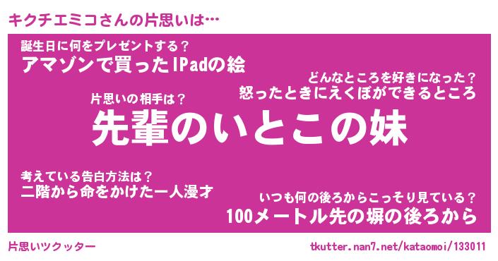 | ヘコむあだ名 | 『キクにゅー』『なまこ酢』 |