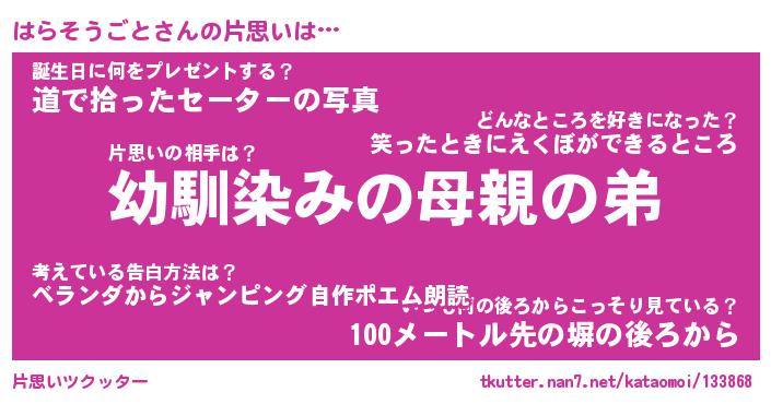 | 胡散臭い通販商品みたいなあだ名 | 『必ず成功するブレスレット…その名も「はらそうごと」』 |