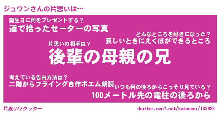 | ヘコむあだ名 | 『ジュにー』『なまこ酢』『ジュっぺ』 |