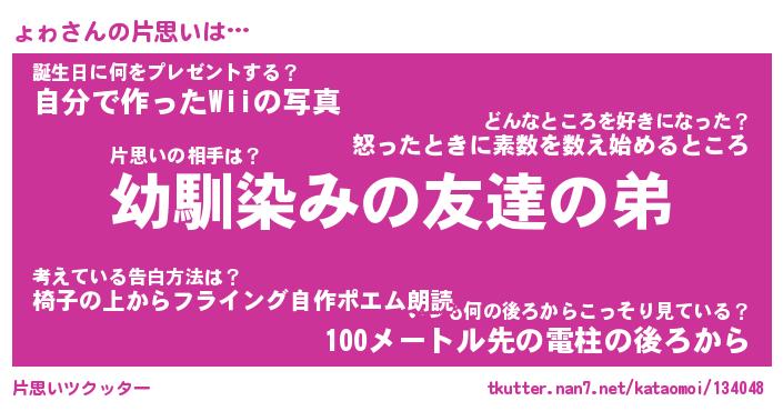 | ヘコむあだ名 | 『ょゎっふぃ~』『つくし』『ょゎを』 |