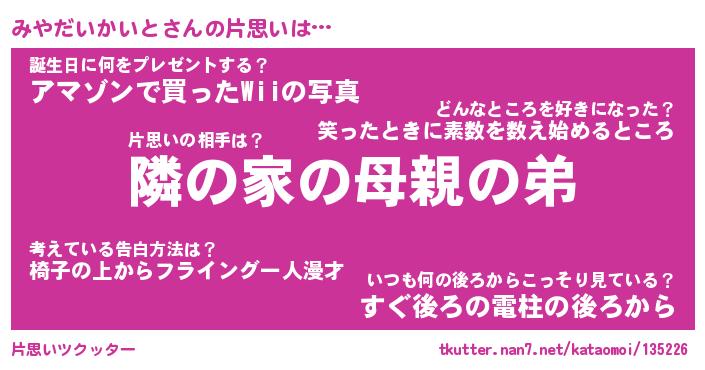 | 胡散臭い通販商品みたいなあだ名 | 『必ず成功するブレスレット…その名も「みやだいかいと」』 |