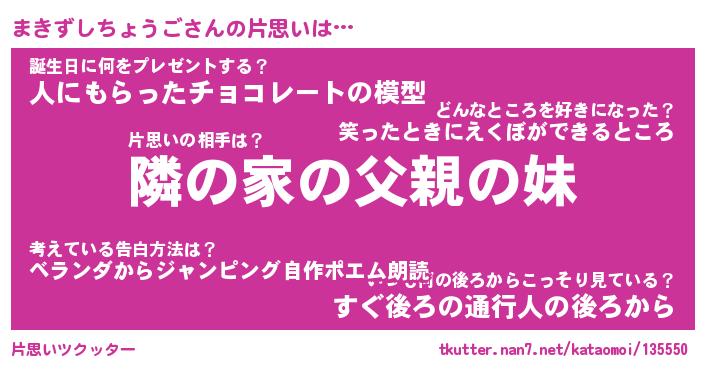 | 男性向けラノベタイトル風あだ名 | 『まきずしちょうごの憂鬱』 |