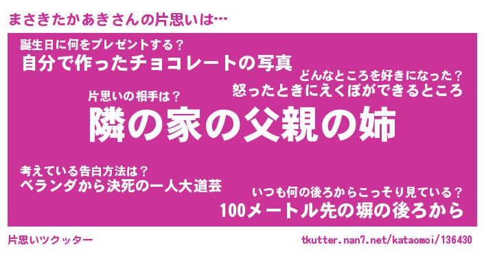 | 女子向けラノベタイトル風あだ名 | 『(仮)まさきたかあきのやんごとなき事情』 |