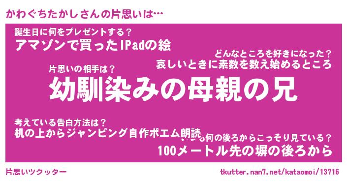 | 女子向けラノベタイトル風あだ名 | 『(仮)かわぐちたかしのやんごとなき事情』 |