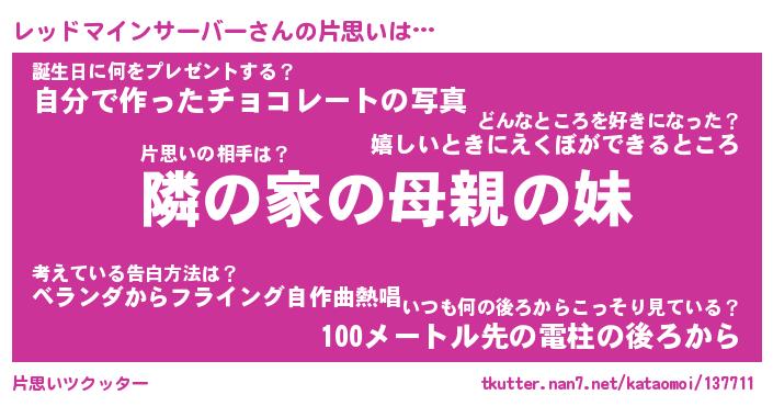 | 男性向けラノベタイトル風あだ名 | 『レッドマインサーバーの憂鬱』 |