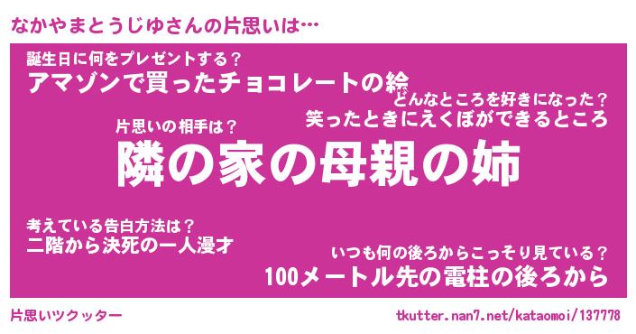 | 女子向けラノベタイトル風あだ名 | 『(仮)なかやまとうじゆのやんごとなき事情』 |